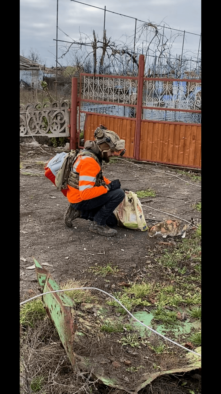 В итоге пришлось покинуть село. Знаете, я первый раз специально поехал в село только с целью, чтобы поехать [и узнать] есть ли коты, живы ли они. Я на тот момент находился в Киеве. Я поездом приехал в Николаев, договорился с соседом, и мы с соседом поехали. Все, что я вез с Киева — это переноску для котов и корм кошачий. Честно сказать, это потом стало таким, я даже не знаю, как это правильно назвать, не маразмом, но мои родственники, мое окружение это видели каким-то маразмом, потому что я всеми правдами и неправдами пытался добраться до села, и каждый раз я брал с собой переноску и корм. Я всегда дома оставлял корм, всегда открывал в подвале пару мешков. В полуразрушенном доме я на столе тоже оставлял раскрытый корм. Каждый раз я приезжал, и не было, не было, не было, не было, я всегда ездил и верил. Родственники сильно были против, потому что, представьте, когда в селе были одни, вторые, сколько там сюрпризов. Там и растяжки встречались, я лично видел. У меня много, взять даже мой Тик-ток, видосов, где я снимал все происходящее, уже после боевых действий: то, что я находил, то, что я видел там, свой дом непосредственно. В итоге мне с 25 поездок удалось найти троих, еще одну кошку не могу найти. Еще самое обидное, самую любимую.